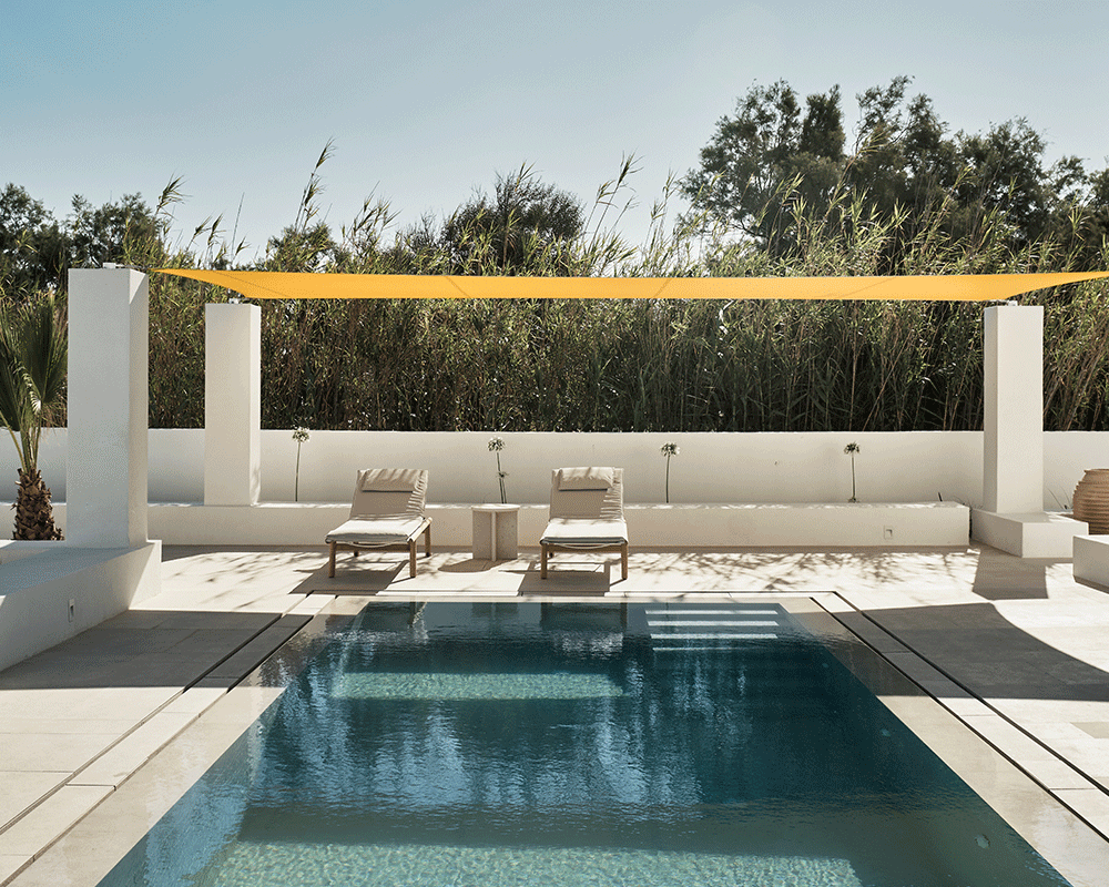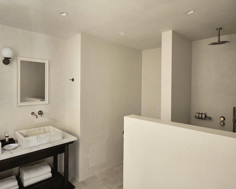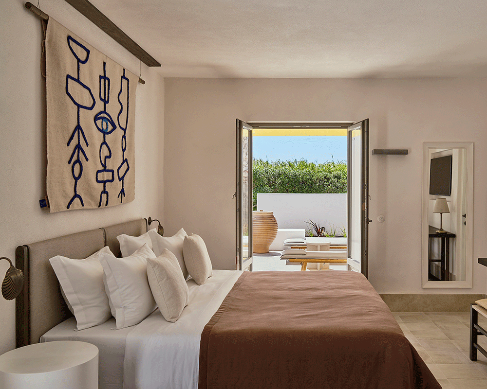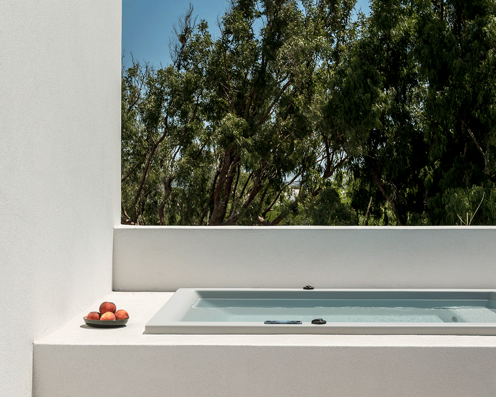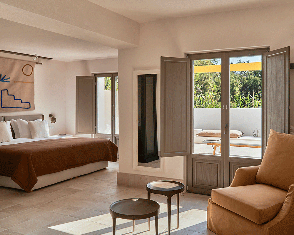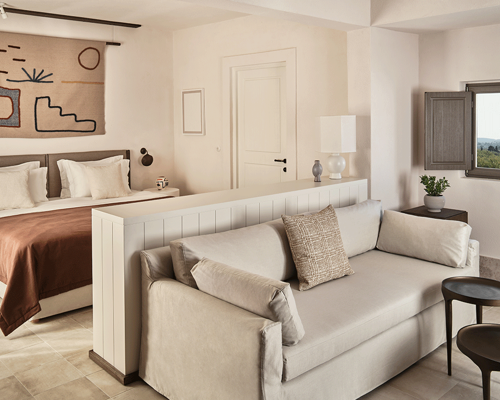(sleep 2) of 40m² is located on the first floor and boasts views to the surrounding nature, pool, beach or Kolymbithres bay. It features a comfortable bedroom with king-size bed, separate living area with a sofa-bed, luxurious bathroom with rainfall shower and a private terrace with outdoor jacuzzi, sunbeds and table.